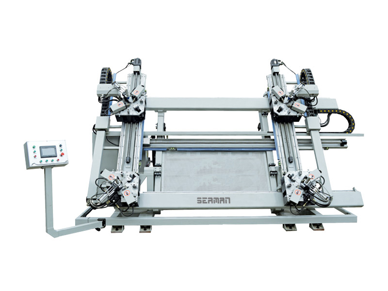 ●四機(jī)頭均設(shè)有可伸縮大行程輔助外定位裝置,方便可靠的進(jìn)行扇料組角;